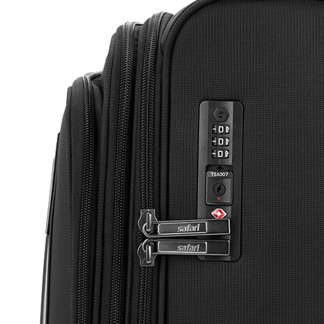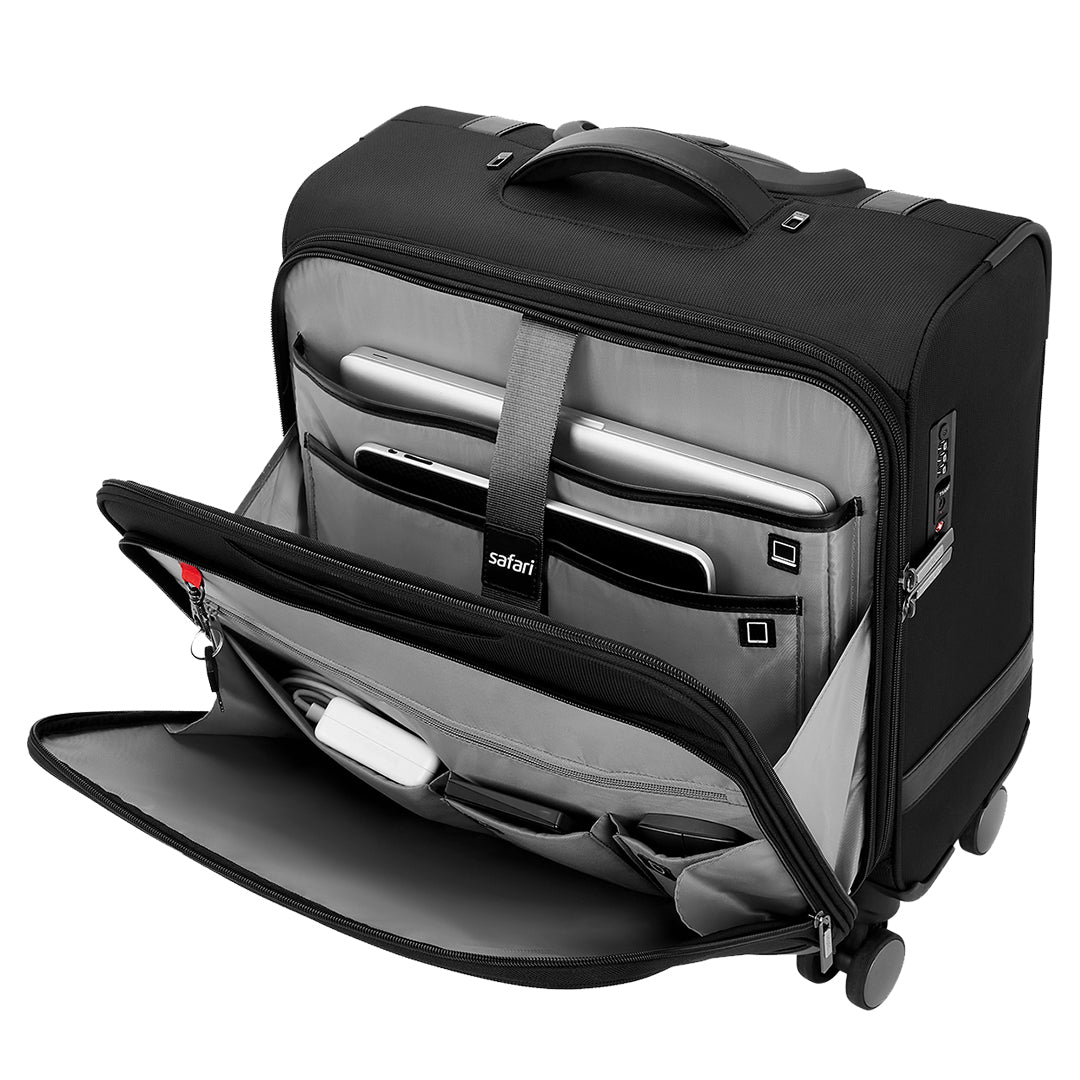 Safari Falcon Black Overnighter Laptop Trolley Bag with TSA Lock and Detailed Interior.