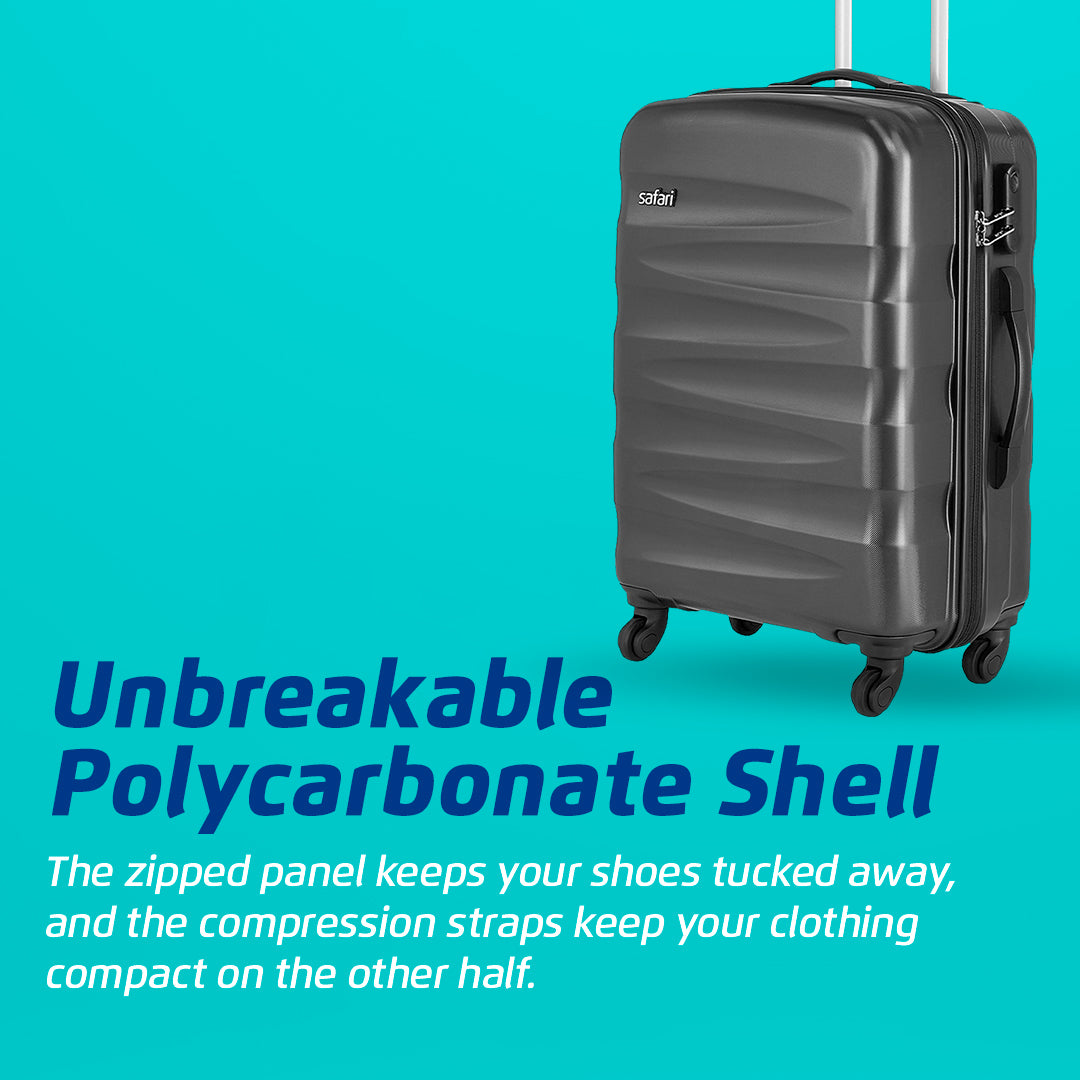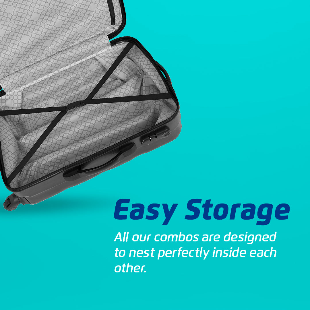 Safari Ngage Trolley Bag, a versatile combo set that includes cabin, medium, and large sizes, designed to fit snugly in a nested form...