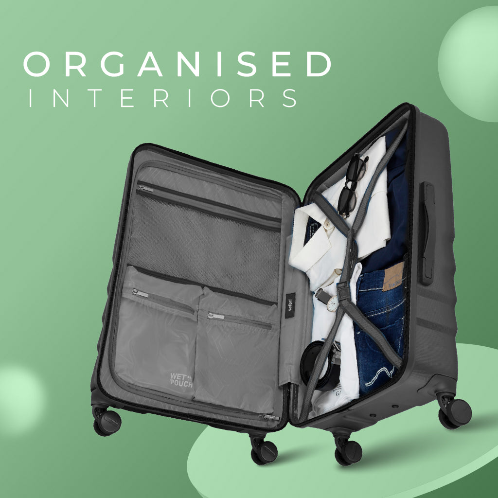 Safari Polaris Pro Castle Black Trolley Bag with TSA Lock, Dual wheels, Side Hooks and Wet Pouch