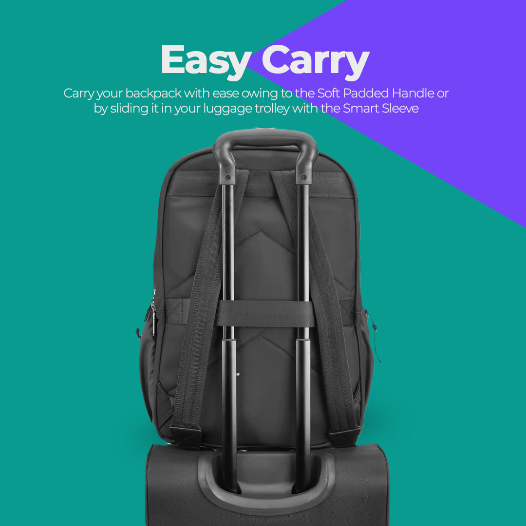 Carry your backpack with ease owing to the Soft Padded Handle or by sliding it in your luggage trolley with the Smart Sleeve